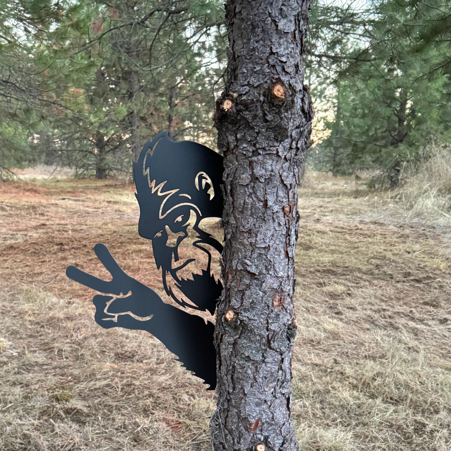 Designed to be mounted on a tree or post, this clever sign creates the illusion of a grumpy Bigfoot peeking around the corner.