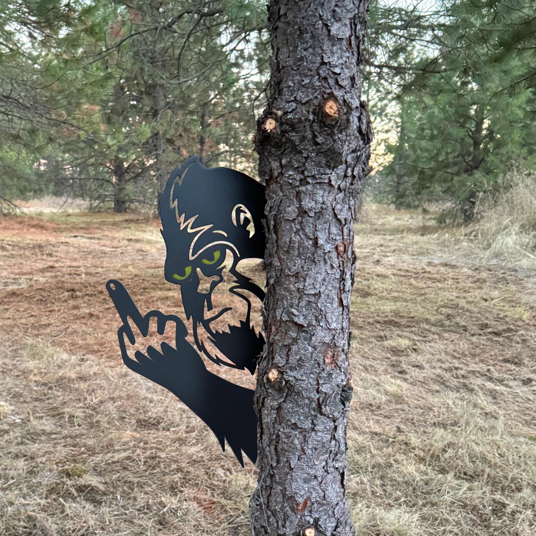 Bigfoot with glowing eyes, giving the middle finger metal art